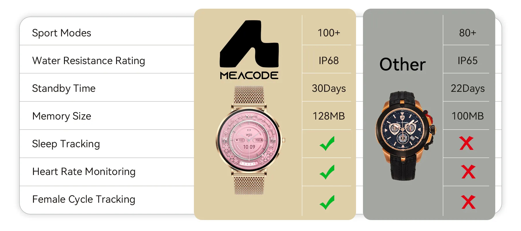 Die Meacode Smart Watch war ihre Antwort. Sie ist ein eleganter Begleiter mit einem ultra-schlanken Design und umfassender Gesundheitsüberwachung. Das Produkt wurde so entwickelt, dass sie nie wieder einen Kompromiss eingehen muss.