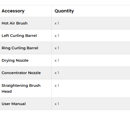 Includes hot air brush, left and ring curling barrels, drying and concentrator nozzles, and straightening brush head for versatile styling. Hot air brush dries hair quickly while creating natural curls; curling barrels shape soft waves effortlessly; nozzles focus airflow for faster drying; brush head smooths and straightens hair. Versatile and professional styling in one.