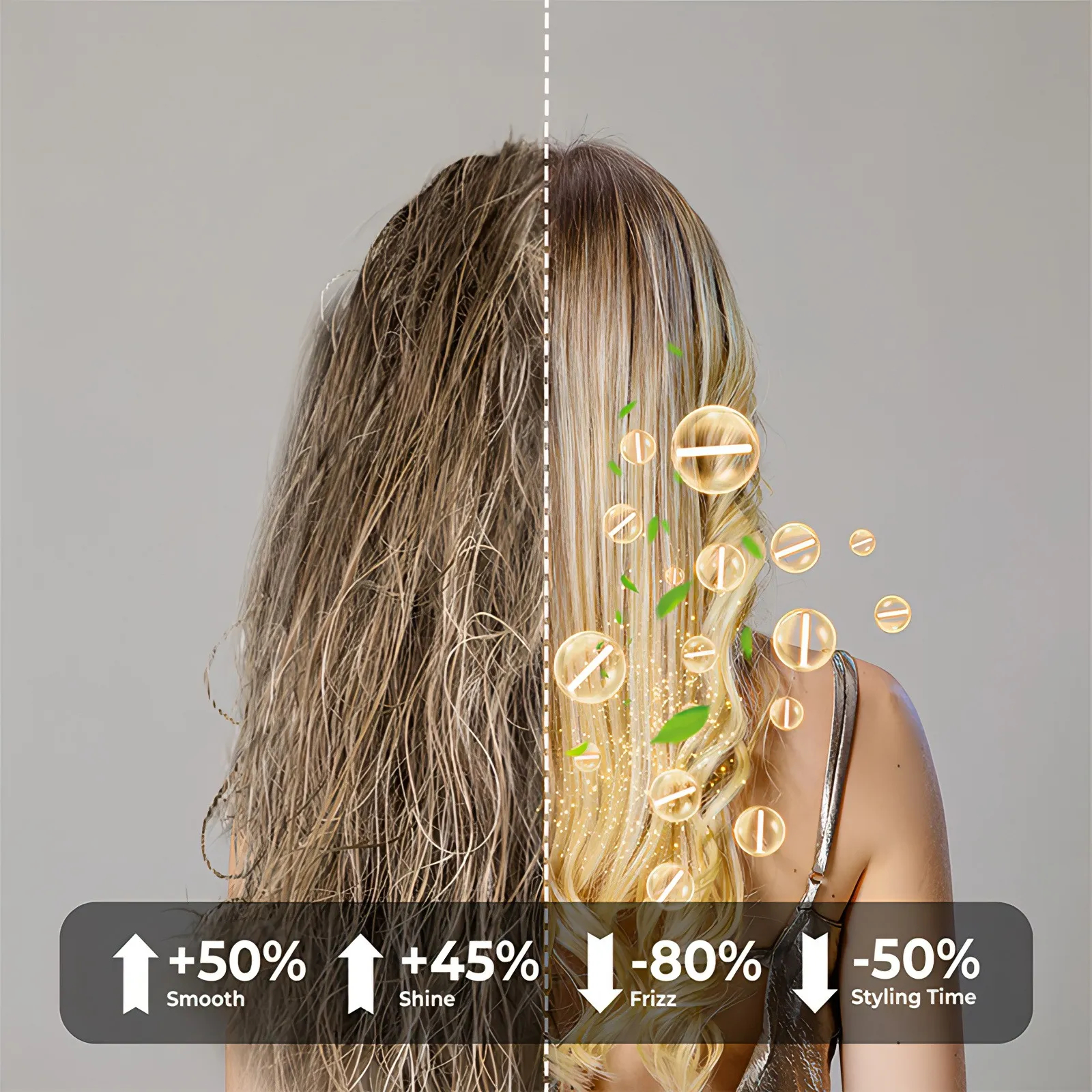 Delivers a remarkable 50% improvement in hair smoothness and 45% boost in shine, while effectively reducing frizz by 80% and cutting styling time by half, creating an impeccable hair experience.